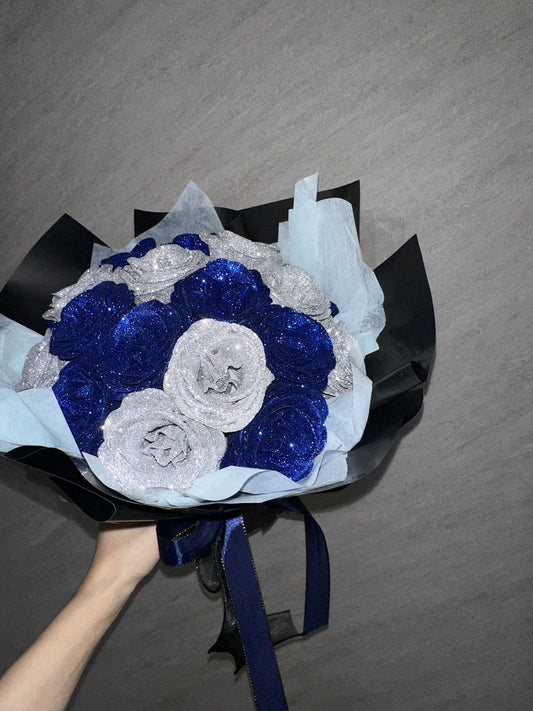 𓊆特注グリッターローズ21本𓊇 ペーパーワンホンブーケ 青×銀